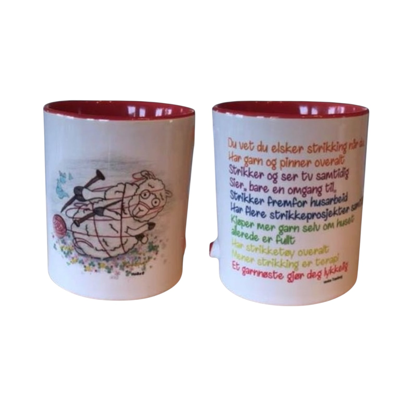 Flott gave til en som elsker å strikke. Navn kan settes på koppen om ønskelig.